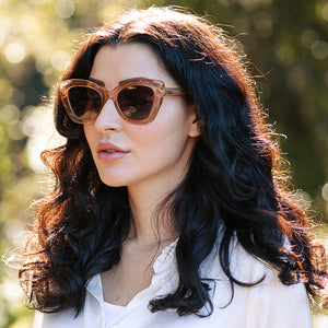 With striking lines and bold proportions, our 100% plant based Eden sunglasses are a chic wardrobe staple. Eden Crystal is a modern cat eye frame created from sustainable Castor Seed Oil and finished in a flattering crystal hue. This mid sized frame is suitable for all face shapes.