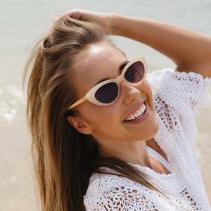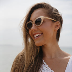 This is an iconic slim cat eye sunglass that never goes out of style. Favoured by style icons for generations, our Savannah is finished in a warm cream tone with white maple wood arms and fitted with gradient brown lenses.